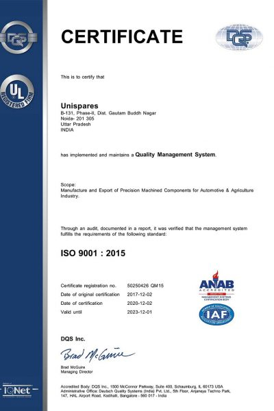 We believe it’s important to achieve excellence in the manufacturing of specific parts for the agricultural, automotive, construction, and industrial machinery. And to provide our client the best and always perfect up to the specifications we often continuously keep adding and improving our quality control procedures and parameters. We have a dedicated team for carrying out quality improvement in totality. We have also been certified with ISO 9001:2015 by UL DQS for our standard and best quality management system which is at par with global standards.